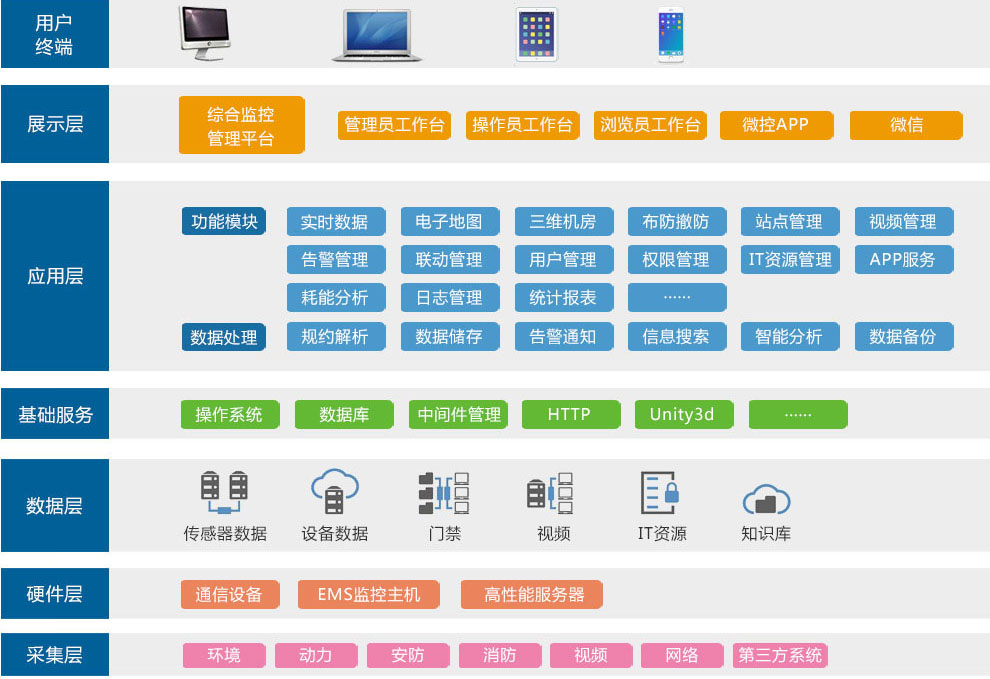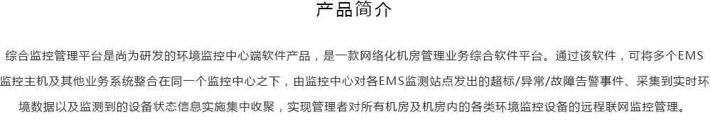 綜合監(jiān)控管理平臺(tái)是尚為研發(fā)的環(huán)境監(jiān)控中心端軟件產(chǎn)品,是一款網(wǎng)絡(luò)化機(jī)房管理業(yè)務(wù)綜合軟件平臺(tái)。通過(guò)該軟件,可將多個(gè)EMS監(jiān)控主機(jī)及其他業(yè)務(wù)系統(tǒng)整合在同一個(gè)監(jiān)控中心之下,由監(jiān)控中心對(duì)各EMS監(jiān)測(cè)站點(diǎn)發(fā)出的超標(biāo)/異常/故障告警事件、采集到實(shí)時(shí)環(huán)境數(shù)據(jù)以及監(jiān)測(cè)到的設(shè)備狀態(tài)信息實(shí)施集中收聚,實(shí)現(xiàn)管理者對(duì)所有機(jī)房及機(jī)房?jī)?nèi)的各類(lèi)環(huán)境監(jiān)控設(shè)備的遠(yuǎn)程聯(lián)網(wǎng)監(jiān)控管理。