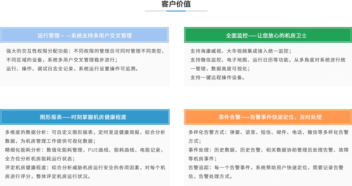 全面監(jiān)控——讓您放心的機(jī)房衛(wèi)士 多樣化告警方式:彈窗、語(yǔ)音、短信、郵件、電話(huà)、微信等多 樣化告警方式; 事件處理:歷史數(shù)據(jù)、歷史告警、相關(guān)數(shù)據(jù)協(xié)助管理員處理告 警、故障等機(jī)房事件; 告警追蹤:每一個(gè)告警事件,系統(tǒng)幫助用戶(hù)快速定位,簡(jiǎn)要記 錄告警信,告警處理方式。 |