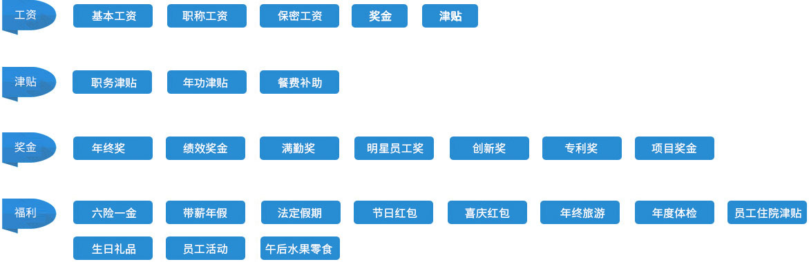 福利=六險(xiǎn)一金+帶薪年假+法定假期+節(jié)日紅包+喜慶紅包+年終旅游+年度體檢+員工住院津貼+生日禮品+員工活動(dòng)+午后水果零食